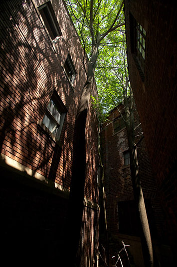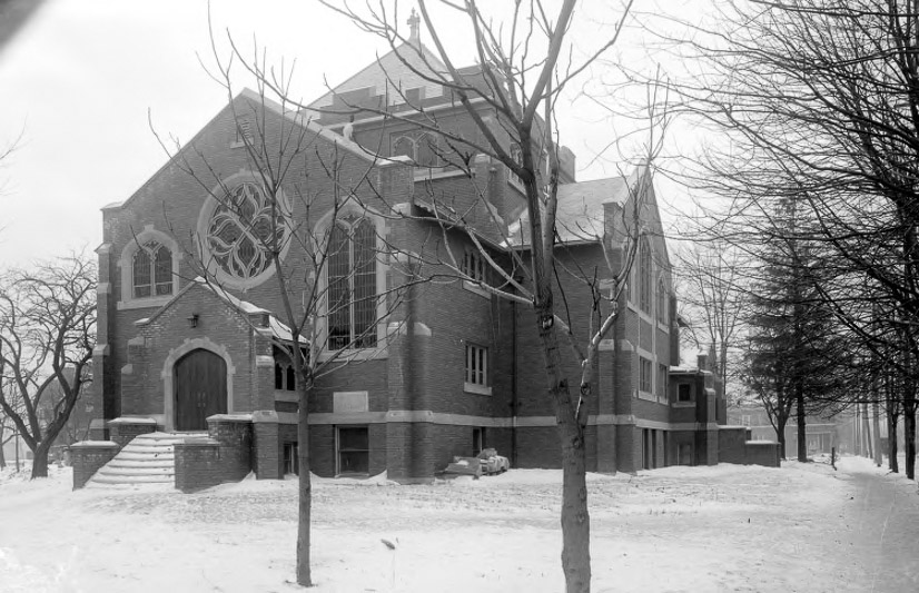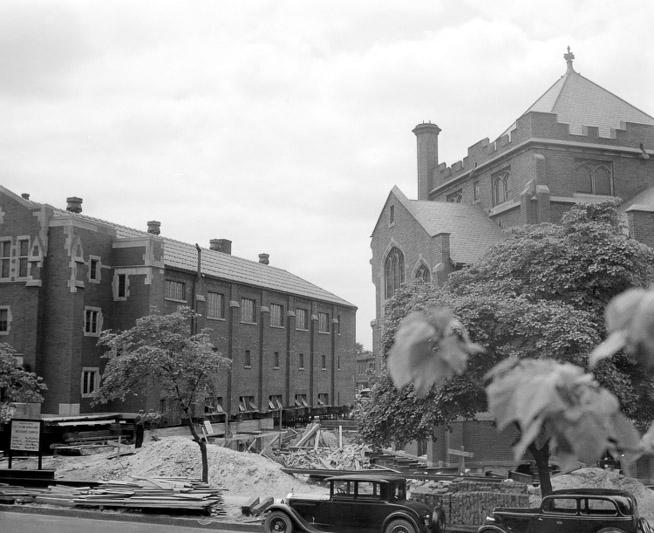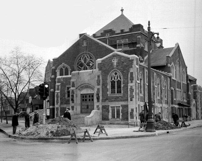 Where once the church had stood at least 10 feet back from Gratiot Avenue, the road was widened in the 1930's, cutting off the fronts of many stores and places of worship and bringing the road right up to the edge of the church. In 1936, East Grand Boulevard was widened as well, and to accommodate the wider street, the parish house was picked up off its foundation and moved to face Grand boulevard. Several alterations were made to the sanctuary; the southwest corner was removed to make way for the parish house, which then joined the rear of the church, while the porch of the sanctuary was removed and remodeled to make way for Grand Boulevard. A kitchen was added to the rear of the sanctuary, leaving a small hollow triangle where the three buildings met.