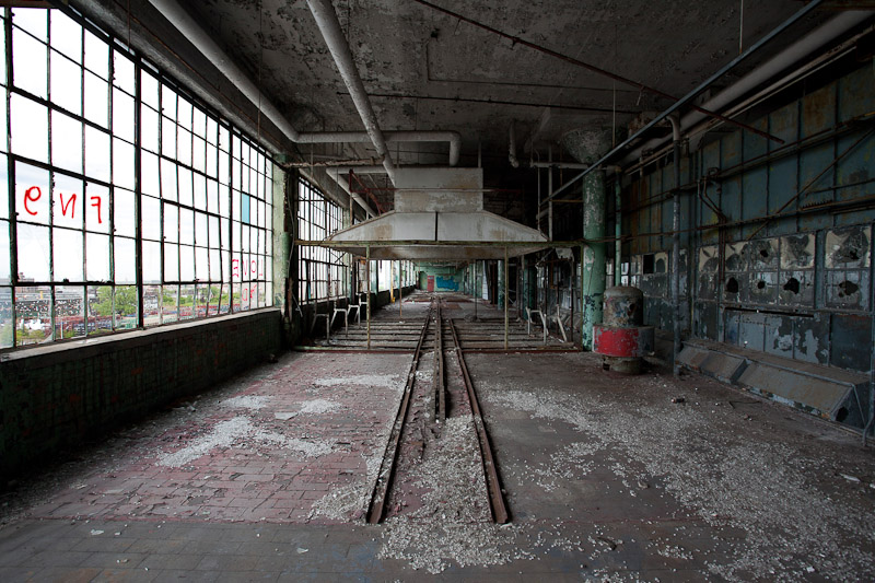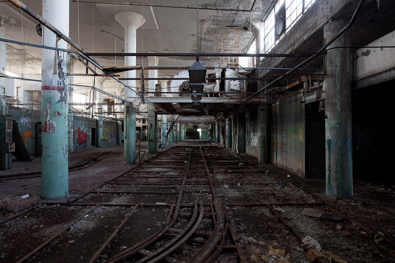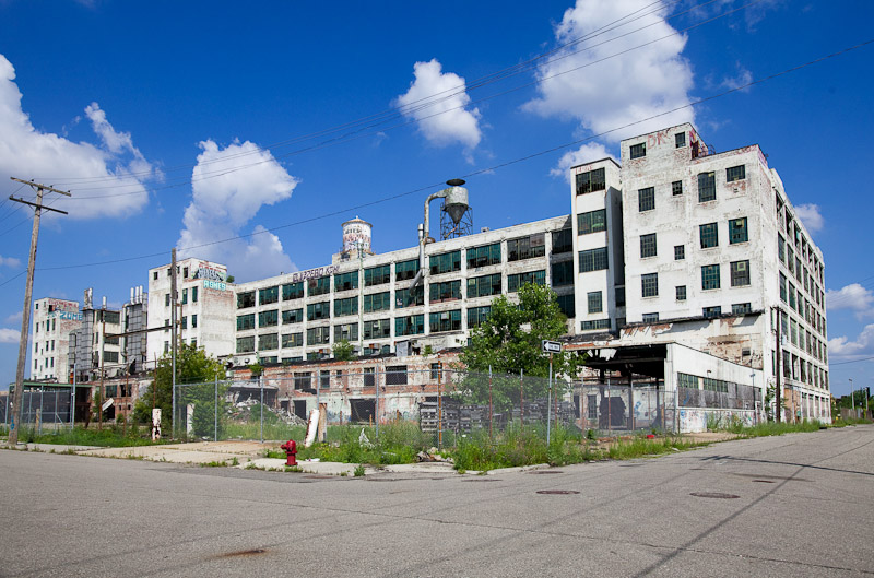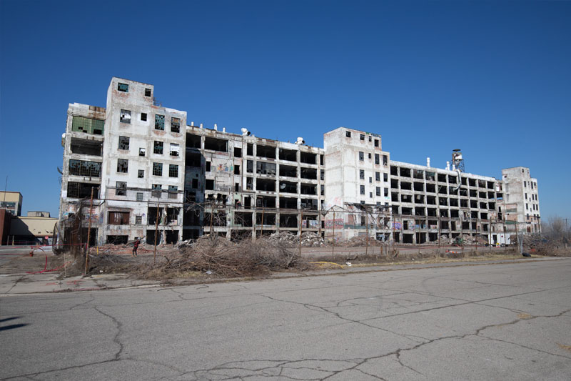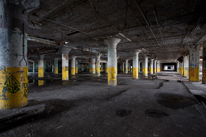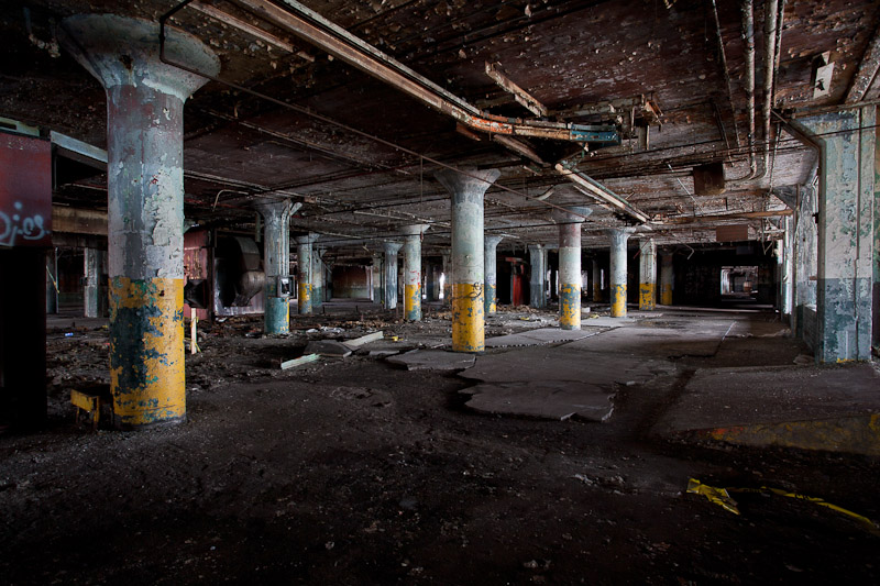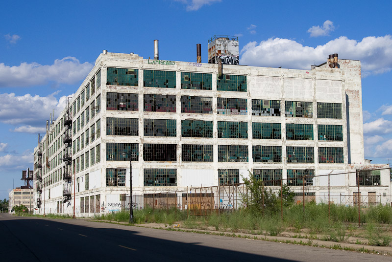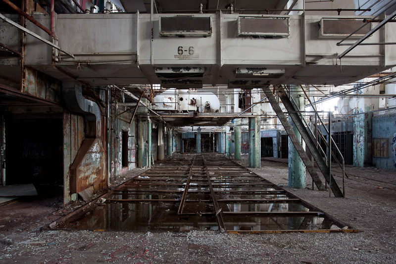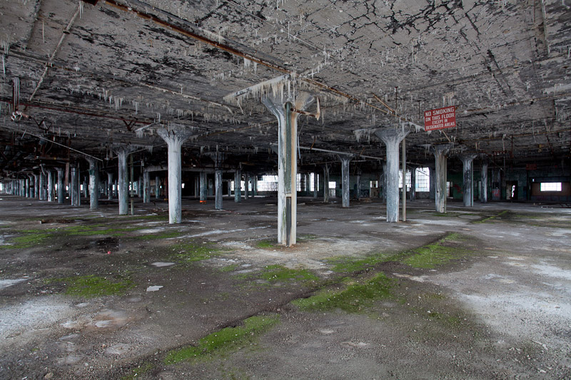 The front of the building facing Harper avenue was cleared and used as a Police auto impound lot. Several sections of the floor caved in, and multiple fires caused extensive damage. Scrappers removed most of the metal parts of the assembly lines.