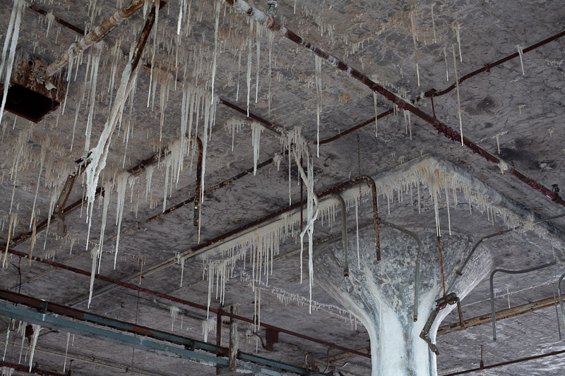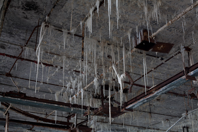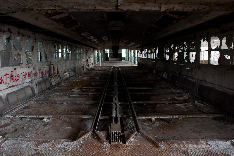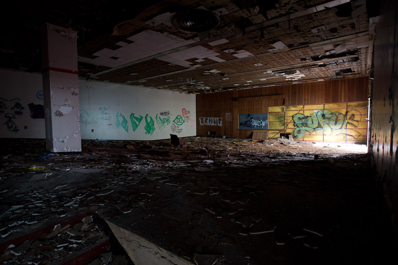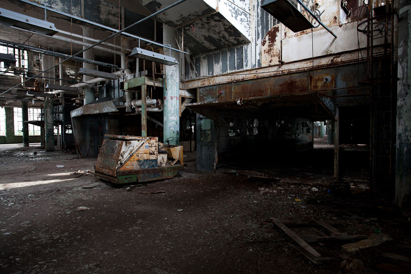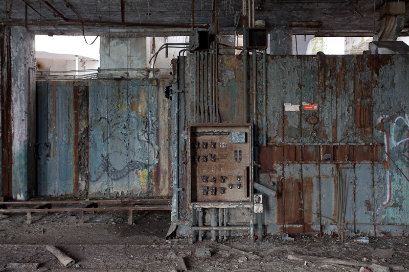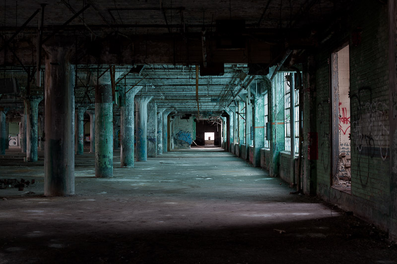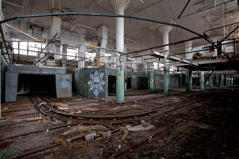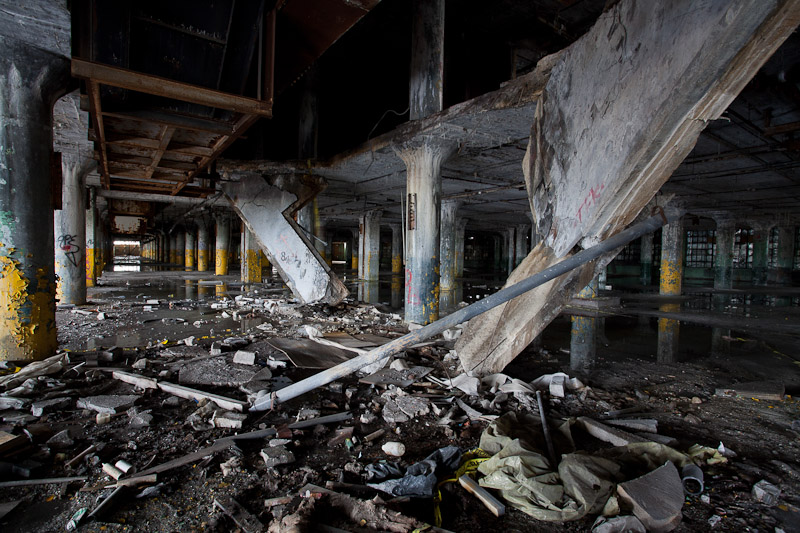 The front of the building facing Harper avenue was cleared and used as a Police auto impound lot. Several sections of the floor caved in, and multiple fires caused extensive damage. Scrappers removed most of the metal parts of the assembly lines.
