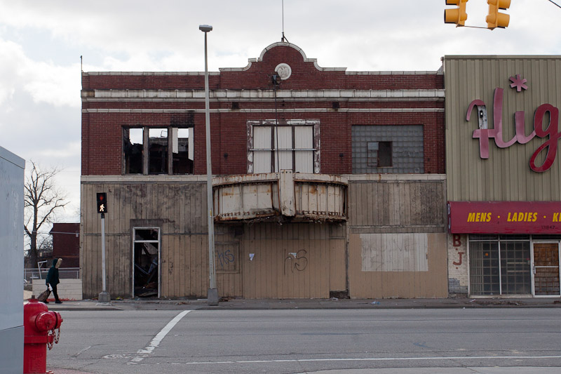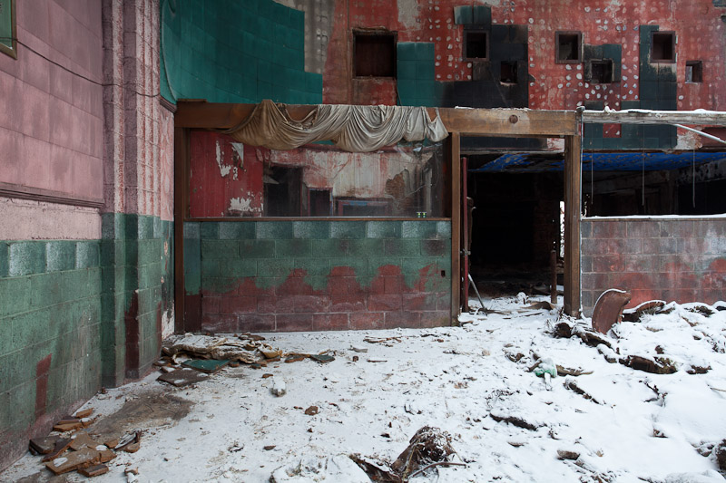 When and under what circumstances it closed is unclear, though it’s plainly obvious that the theater has been in disrepair for a long time. A few details are still visible, mostly painted tiles on the walls. The lobby, a semi-detached building facing Woodward Avenue has burned and partially collapsed. A large fire in July of 2011 burned through the furniture store next door, doing minor damage to the theater.
