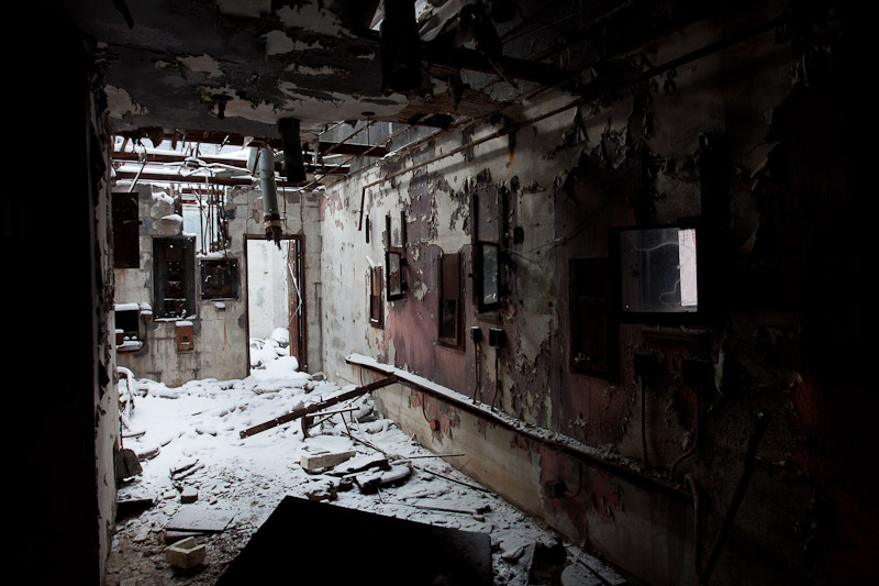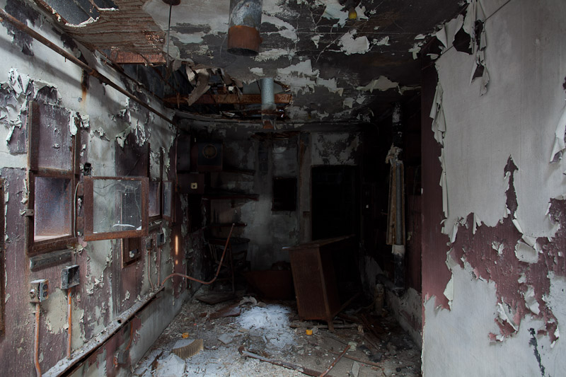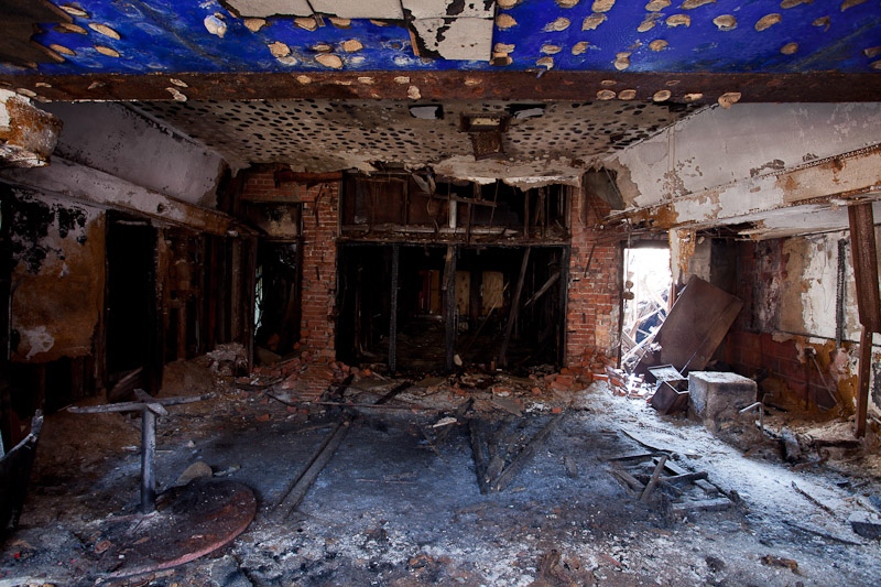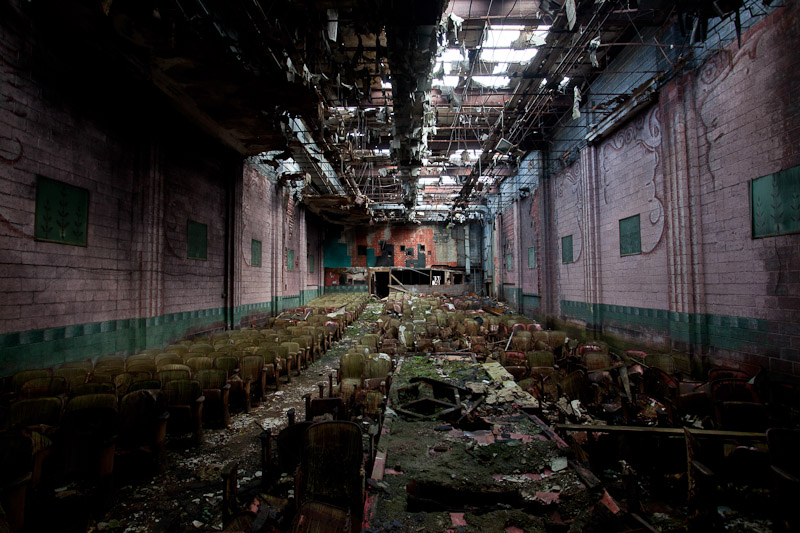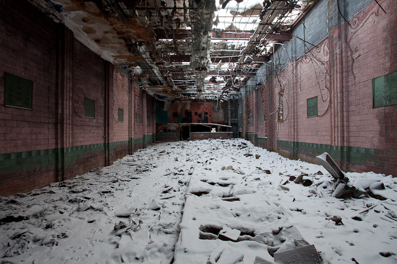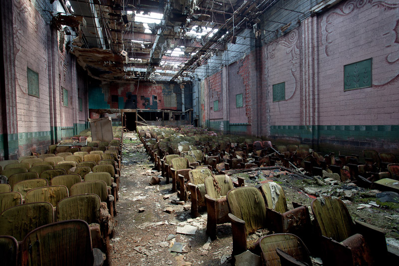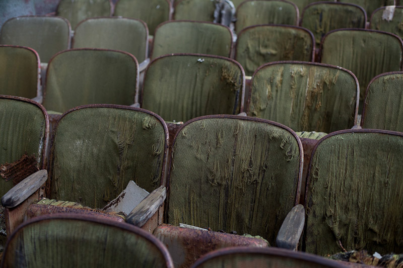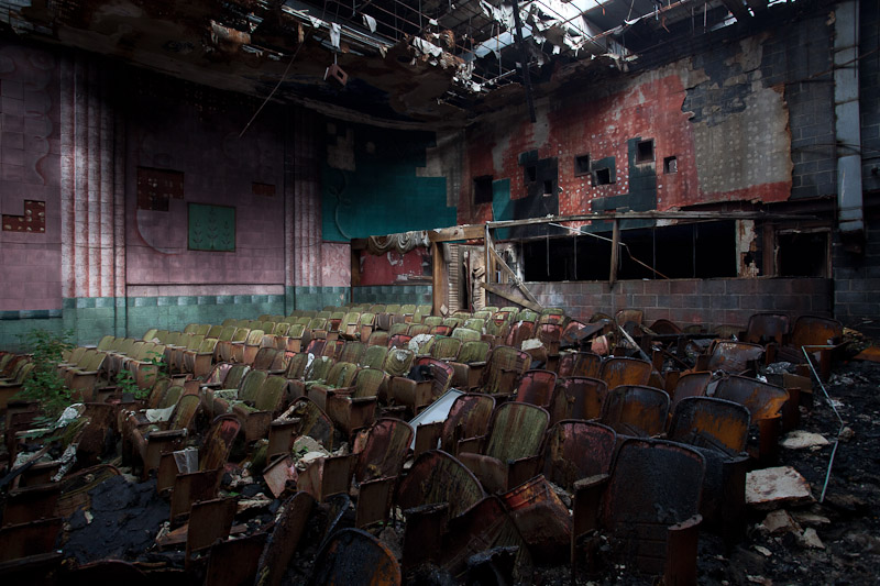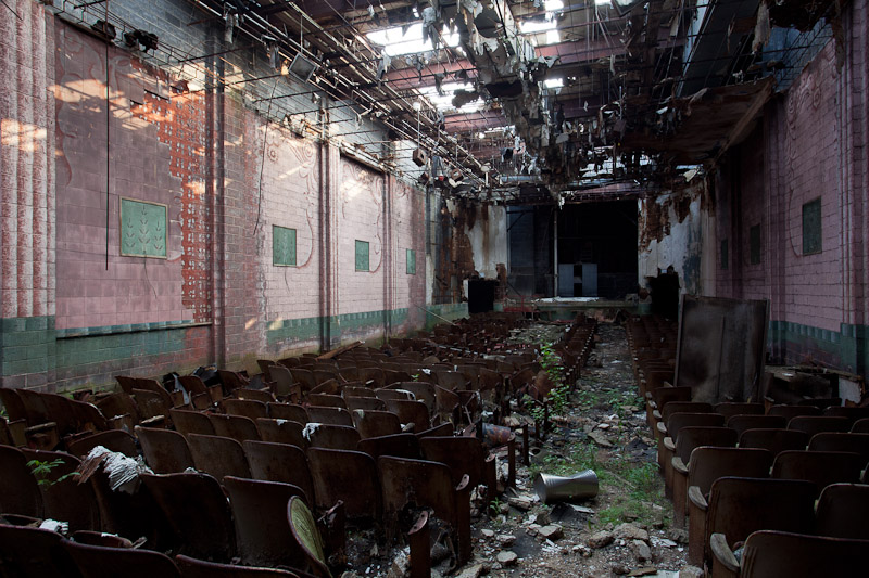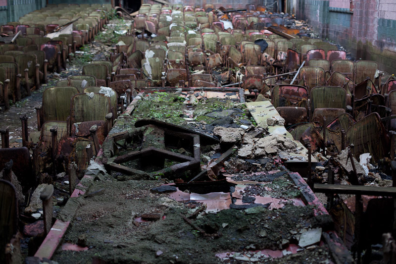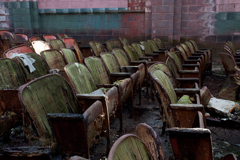 Most of the roof over the theater has fallen in, allowing the elements in and decay to take over. Until the fall of 2011, most of the original theater chairs were still in place, though rusted and rotting. A few months later scrappers had smashed all of them for what little metal was left.