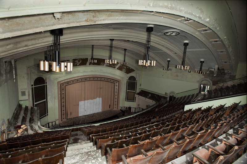 The view from the doorway looking down into the balcony of the auditorium. The thin concrete steps are steeper then they look.